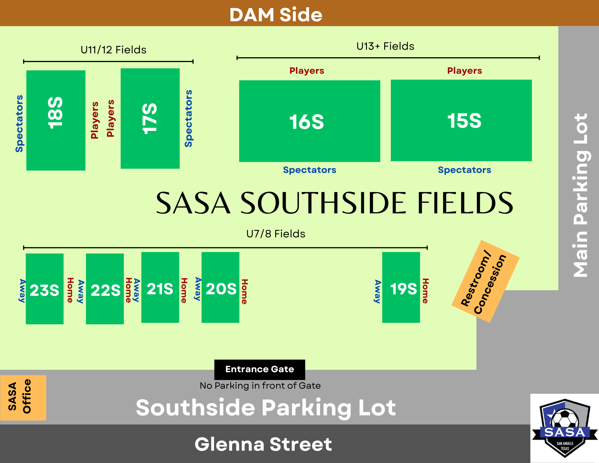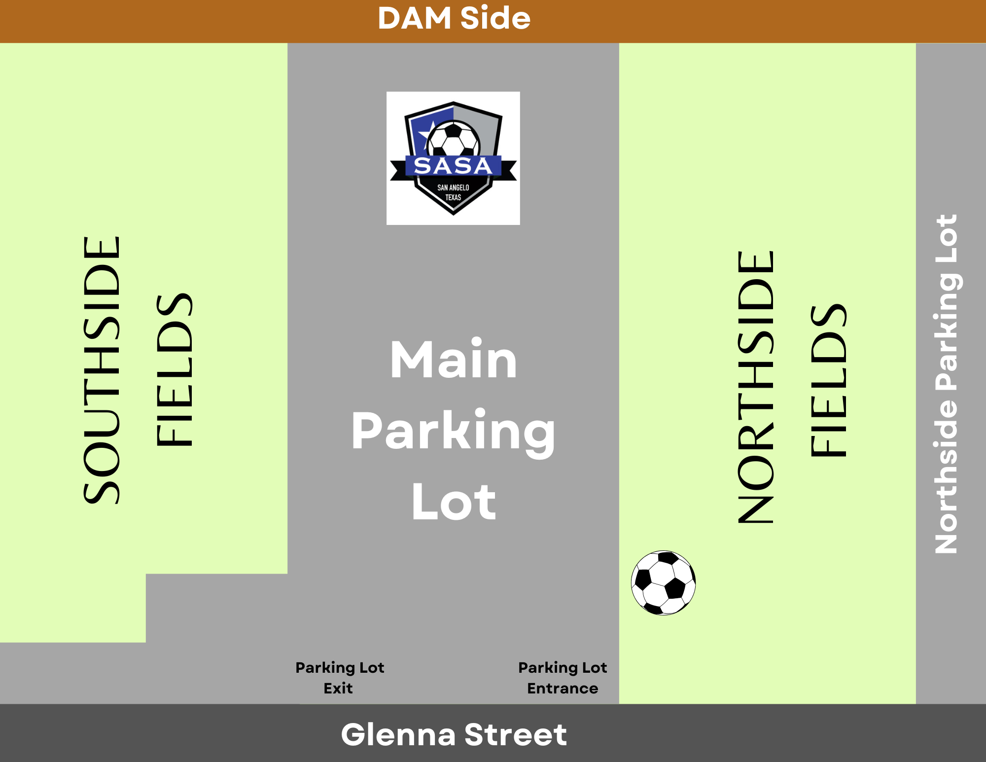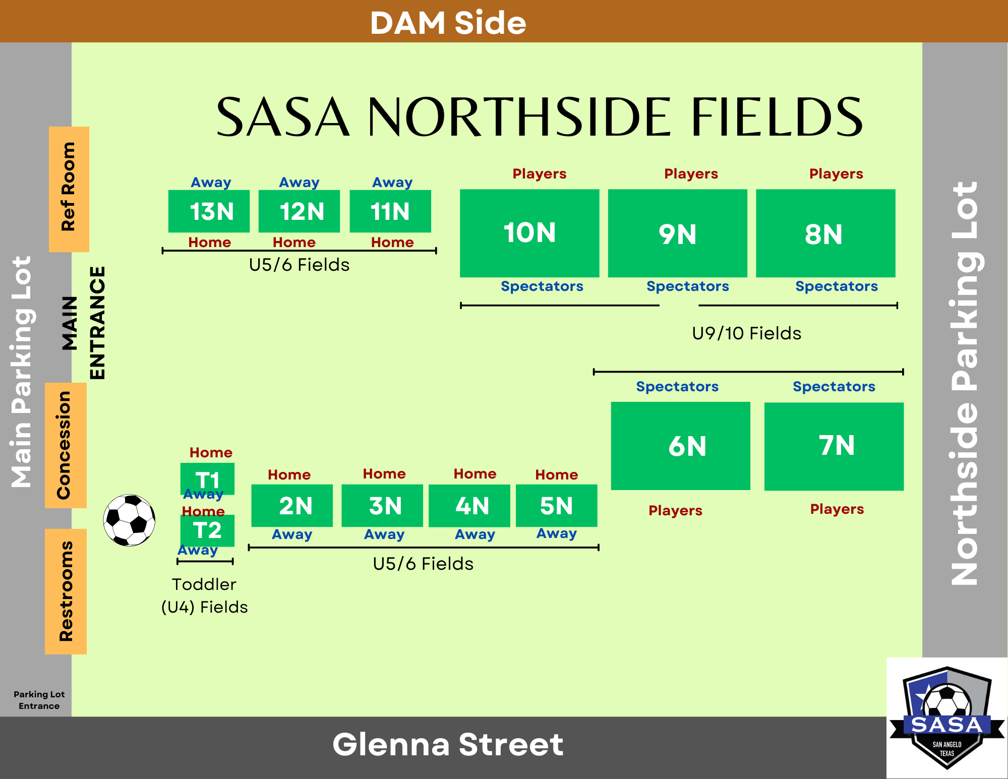 We have fields on both sides of our main parking lot. Fields on the Northside (the side with the big soccer ball) will have an "N" after the number. The fields on the Southside (by the office) will have an "S".