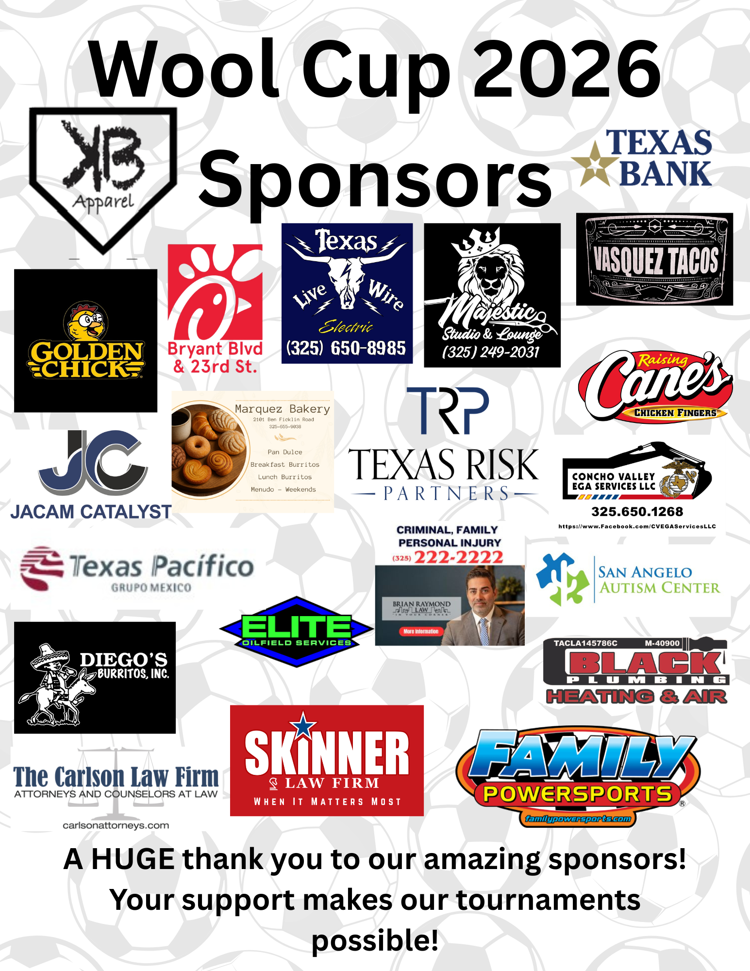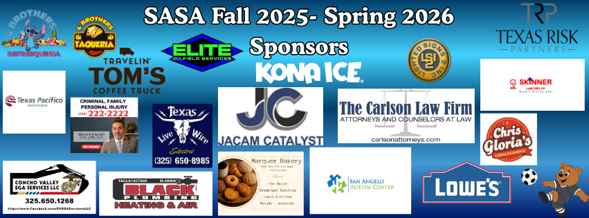 The San Angelo Soccer Association is deeply grateful to our amazing sponsors for their continued support of our players, families, and community. Your generosity helps make youth soccer accessible, supports field and program needs, and provides scholarships so every child has the opportunity to play.